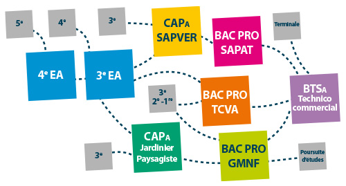 4e - 3e EA Découverte professionnelle CAPA SAPVERServices aux personnes et vente en espace rural CAPA JPJardinier et paysagiste BAC PRO TCVATechnicien conseil vente en alimentation BAC PRO GMNFGestion des milieux naturels et de la faune BAC PRO SAPATServices aux personnes et aux territoires BTSA Technico-commercialProduits alimentaires et boissons |